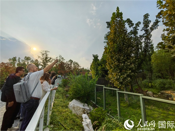 “絲路獎(jiǎng)”獲獎(jiǎng)嘉賓在參觀成都大熊貓繁育研究基地。人民網(wǎng)記者 王影迪攝