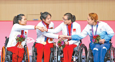 杭州亞殘運(yùn)會輪椅擊劍女子花劍個人B級決賽,中國體育代表團(tuán)運(yùn)動員和泰國體育代表團(tuán)運(yùn)動員(右)在頒獎儀式上握手致意。新華社記者 胡星宇攝