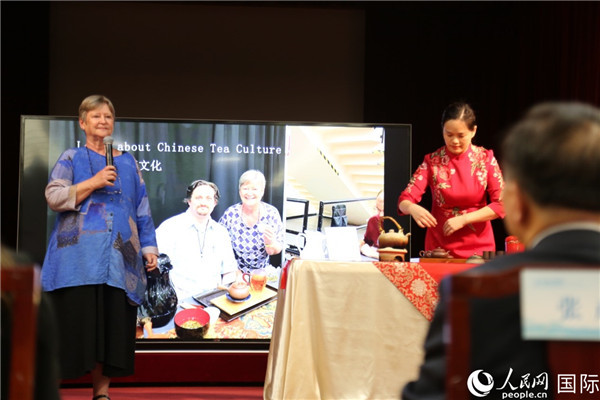 | 福建名茶的美國粉絲辛迪·忒斯庫(Cindy Tuisku)向前來參加推介會的嘉賓講述功夫茶道。人民網(wǎng)記者 鄧圩攝 |