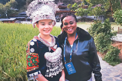 2019年,加納廣播電視臺編輯戴安娜(右)在貴州省一處苗寨與熱情好客的苗族少女合影。記者 楊俊峰攝