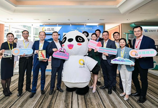 推介會(huì)的外場(chǎng)設(shè)有城市特展區(qū),成都展區(qū)通過(guò)播放宣傳片、展示景區(qū)景點(diǎn)美圖、陳列文創(chuàng)及非遺產(chǎn)品等體驗(yàn)互動(dòng),讓參會(huì)嘉賓深入了解成都,為與會(huì)嘉賓帶來(lái)多重沉浸式游玩體驗(yàn)。