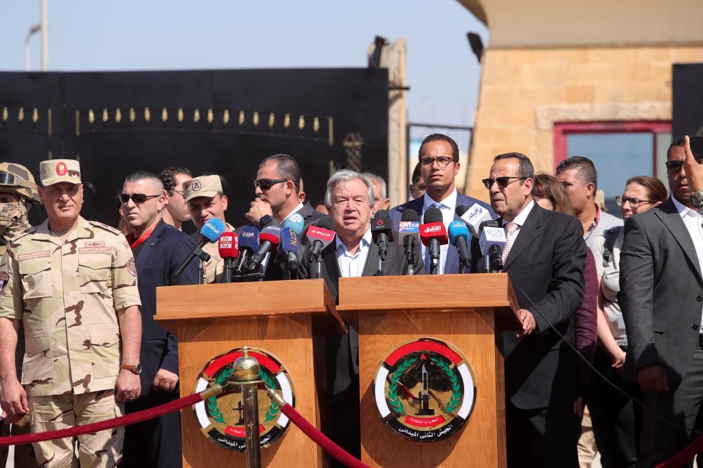 10月20日,在拉法口岸埃及一側(cè),聯(lián)合國(guó)秘書長(zhǎng)古特雷斯(中)發(fā)表講話。新華社發(fā)(艾哈邁德·戈馬攝)