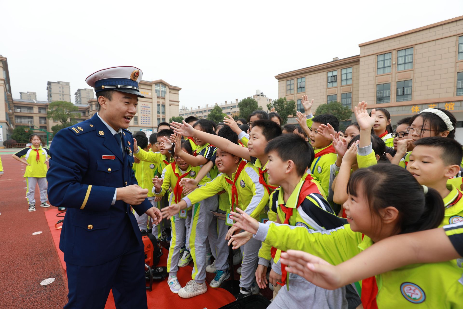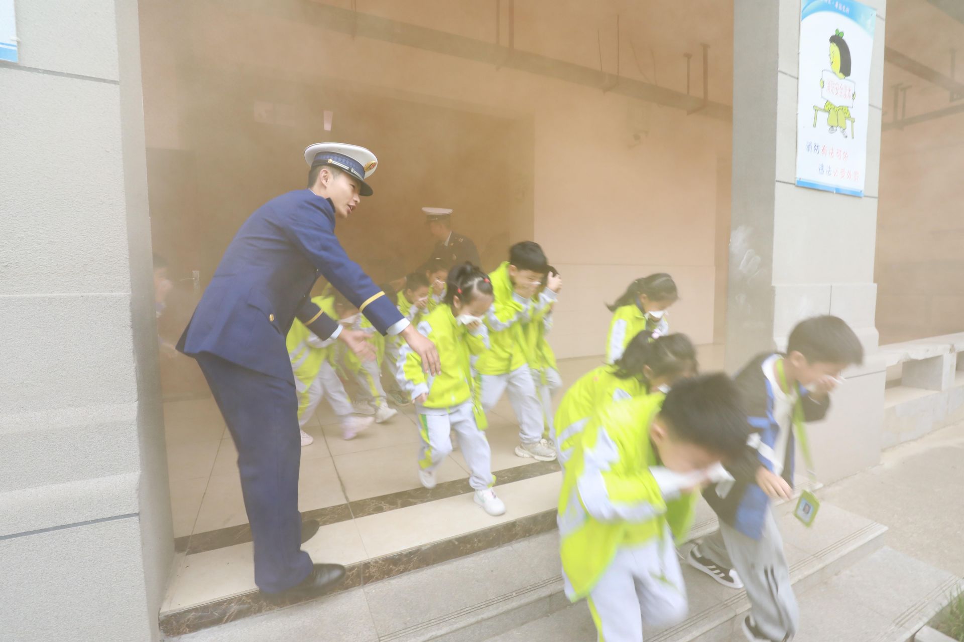 “演練專用煙霧彈被點燃,煙霧迅速彌漫校園,尖厲的警報聲破空而起,廣播提醒全體師生,學校發(fā)生險情,請大家迅速撤離教室樓層。在導引員的指引下,參加演練的師生彎腰捂鼻,低位列隊下樓疏散,快速撤離到校園操場設置的安全區(qū),所有動作從容不迫,有條不紊?!边@是天門杭州華泰中學附屬小學火災現(xiàn)場撤離的逃生演練場景。