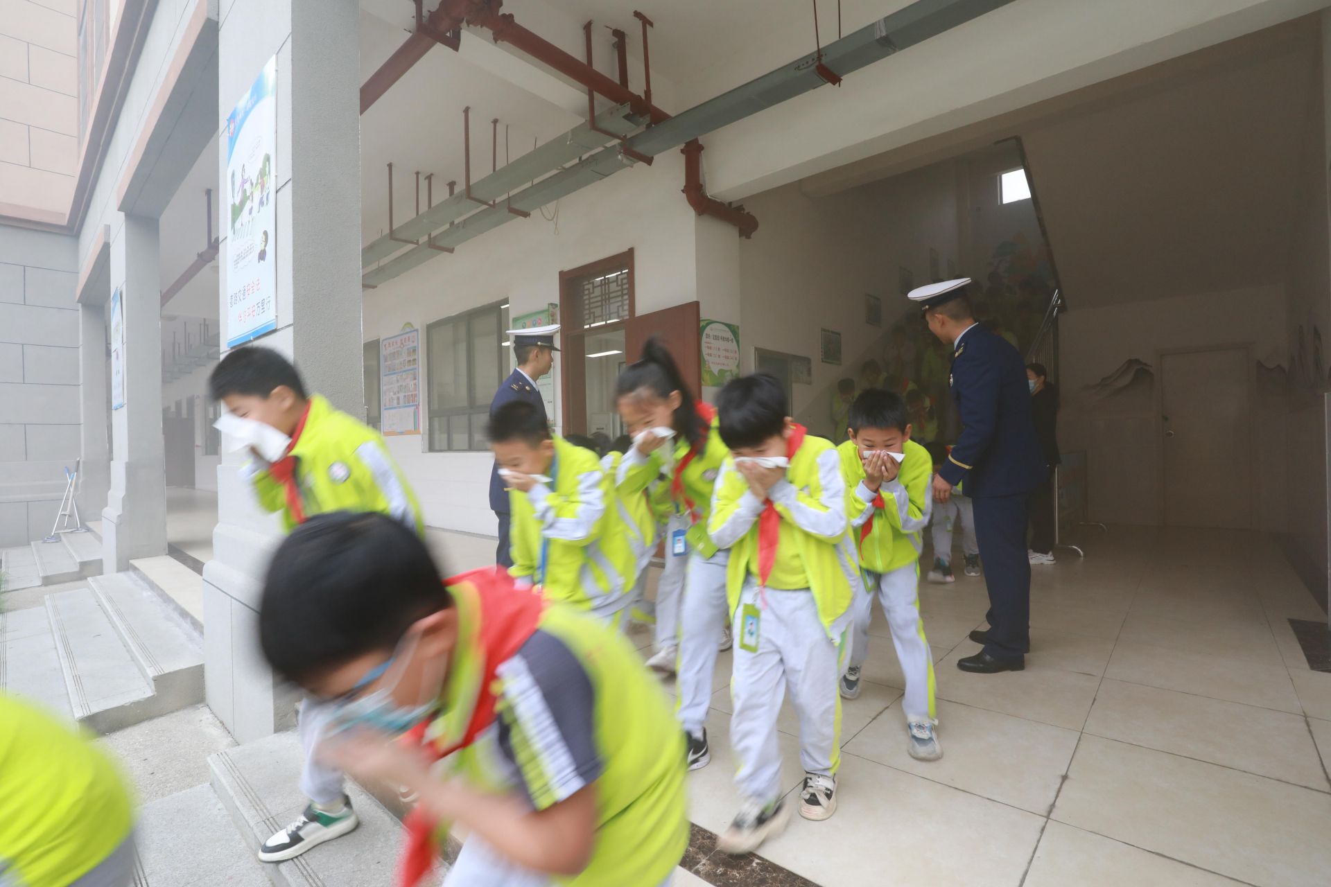 上午9點40分,學校各場地、各樓道定點安全責任人就位。煙霧彈投放員在指定地點待命。警報拉響,演練正式開始。