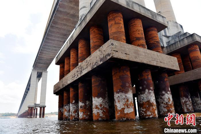 當(dāng)?shù)貢r間10月18日,巴西北部,亞馬孫州首府馬瑙斯市的內(nèi)格羅河大橋因水位下降露出金屬橋墩。中新社記者 林春茵 攝