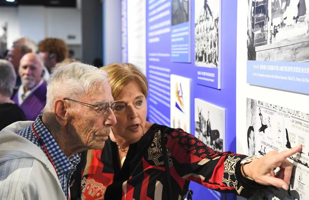 11月1日,在重慶史迪威博物館展廳,嘉蘭惠(右一)和飛虎隊(duì)老兵莫耶在重慶史迪威博物館參觀。新華社記者 王全超 攝