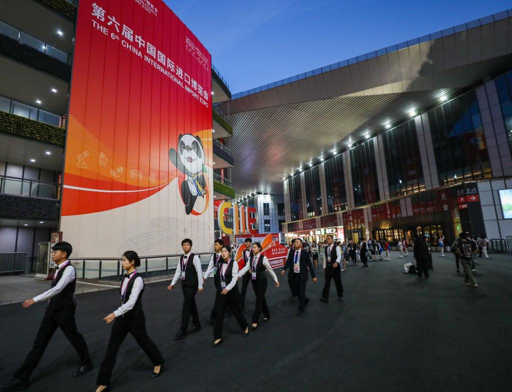 11月5日,工作人員在國家會展中心(上海)經過第六屆進博會巨幅海報。新華社記者 辛夢晨 攝