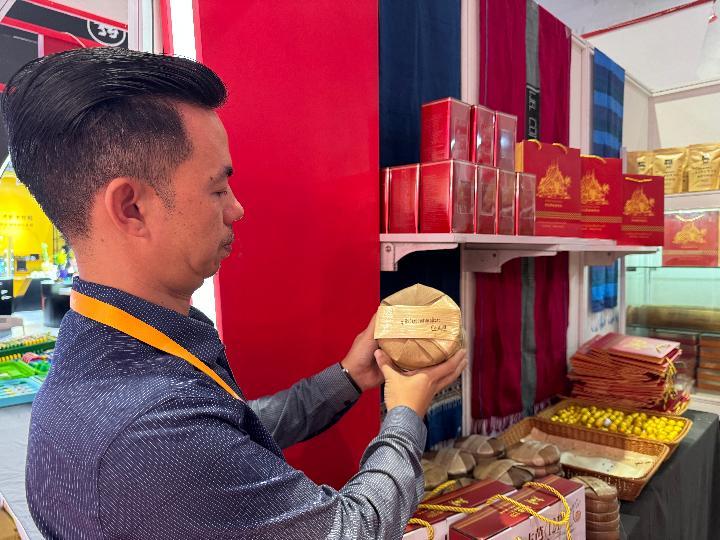 “在老撾,四五百年樹齡的茶樹并不算罕見?!痹撈髽I(yè)負責(zé)人、老撾展商陳天(Thieng Somsat)和生意伙伴一邊沏茶,一邊向記者展示,像這樣的古樹茶葉非常耐泡,常常是喝了一上午,依然清香。