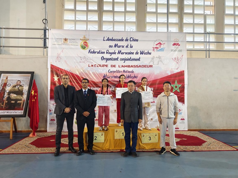 中國(guó)駐摩洛哥大使李昌林(右二)、摩洛哥皇家武術(shù)協(xié)會(huì)主席阿卜杜勒-拉赫曼(左二)等中摩嘉賓為運(yùn)動(dòng)員頒獎(jiǎng)。(中國(guó)駐摩洛哥大使館供圖)
