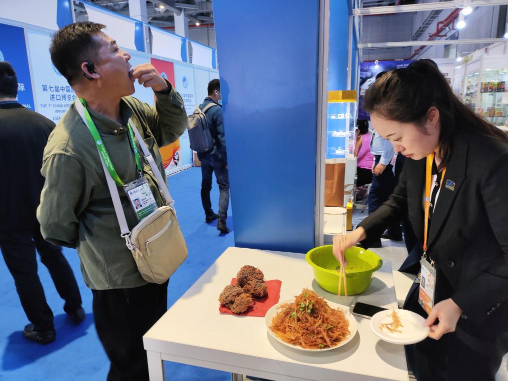 11月7日,第六屆進(jìn)博會(huì)東非商貿(mào)物流中心展臺(tái)前,觀眾品嘗麒麟菜。新華社記者 楊洋攝
