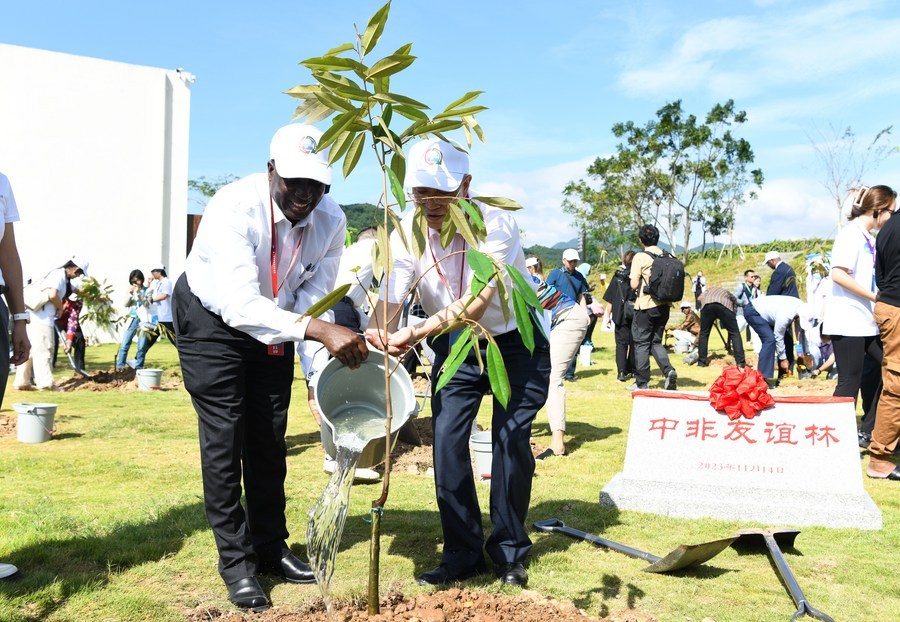 11月14日,參加中非農(nóng)業(yè)合作論壇的嘉賓在海南省三亞市吉陽區(qū)大茅村共植中非友誼林。新華社記者 楊冠宇 攝