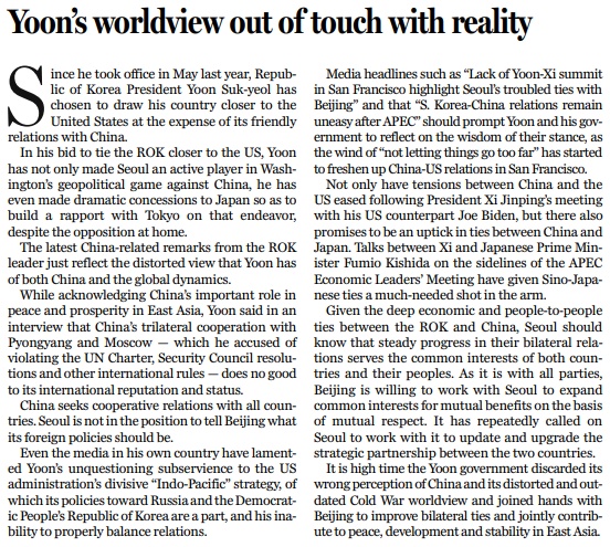 尹錫悅11月20日在接受采訪時(shí)承認(rèn),中國在促進(jìn)東亞自由、和平、繁榮方面起著重要作用。然而與此同時(shí),他又聲稱,中國與公然違反《聯(lián)合國憲章》、安理會(huì)決議和其他國際規(guī)范的朝俄追求三國合作,不利于本國的國際聲譽(yù)和地位。