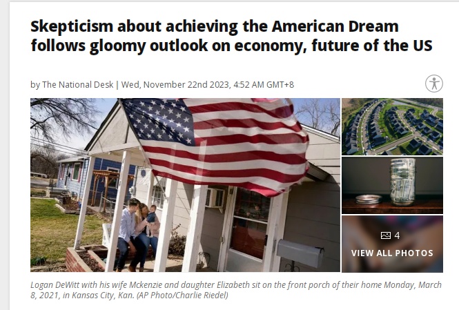 中國日報網(wǎng)22日電 (黨超峰)美國辛克萊廣播集團(tuán)旗下新聞網(wǎng)站“thenationaldesk”22日報道,過去兩年,美國人不但飽受通貨膨脹之苦,還擔(dān)心經(jīng)濟(jì)陷入衰退。許多人對經(jīng)濟(jì)前景和自己的未來持悲觀態(tài)度,對"美國夢 "心存疑慮。