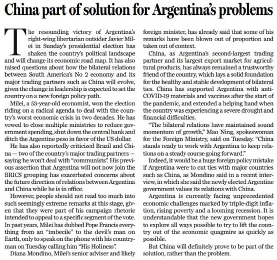 不過,在現(xiàn)階段,外界不應(yīng)過度解讀這類看似極端的言論,畢竟那只是他在競選過程中的部分表態(tài)。米萊的外事顧問迪亞娜·蒙迪諾也表示,外界對米萊的外交政策存在誤讀,沒有哪個國家可以脫離外交關(guān)系來發(fā)展經(jīng)貿(mào)合作。