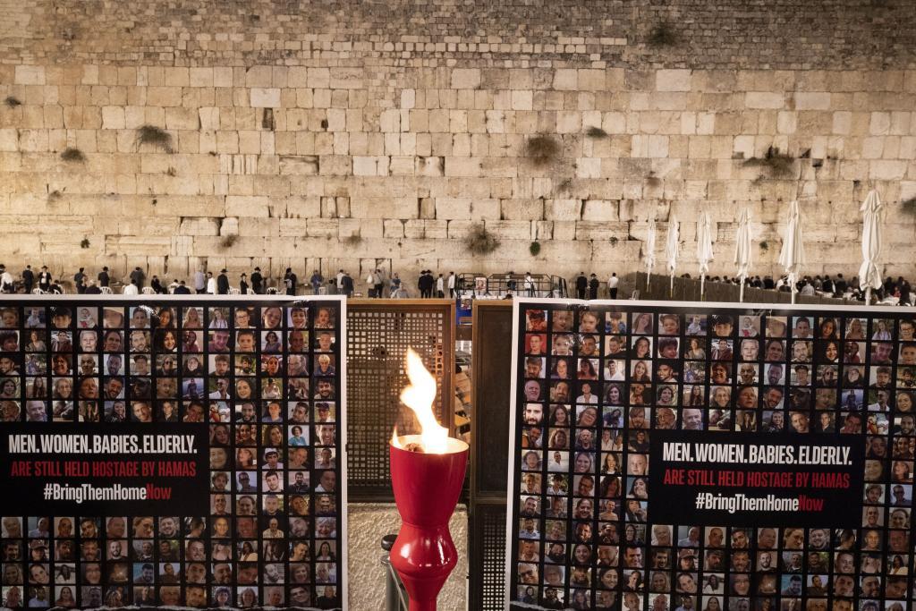 這是11月7日在耶路撒冷老城“哭墻”前拍攝的以色列被扣押人員海報。新華社記者 陳君清 攝