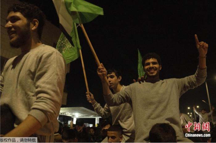 當?shù)貢r間2023年11月24日,以色列釋放的39名巴勒斯坦人抵達約旦河西岸的貝圖尼亞市。