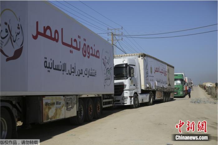 當?shù)貢r間2023年11月24日,隨著巴以臨時?;饏f(xié)議正式生效,載有人道主義援助物資的卡車正從拉法口岸進入加沙地帶。