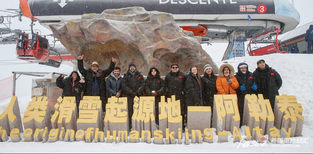 11月25日,上合組織2023旅游年論壇嘉賓在阿勒泰將軍山國際滑雪度假區(qū)合影留念。天山網(wǎng)-新疆日報記者 謝龍攝
