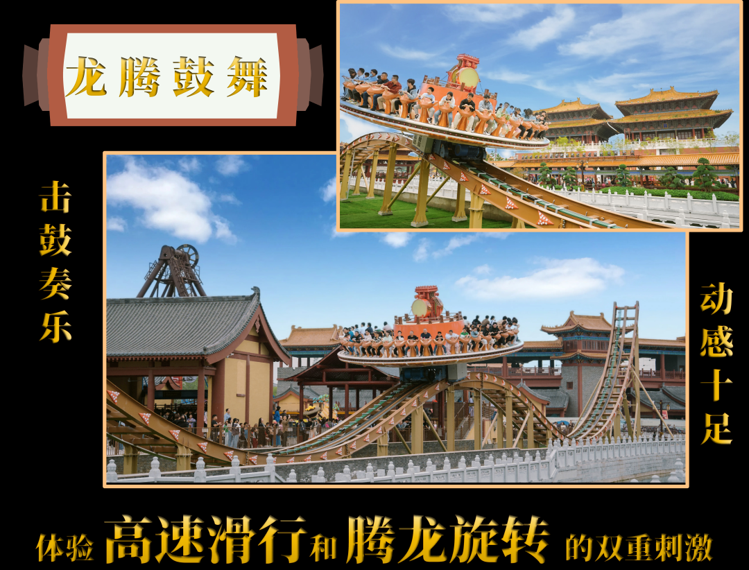 “龍騰鼓舞”游樂設(shè)施伴隨音樂節(jié)奏,動(dòng)感十足,讓游客體驗(yàn)滑行和旋轉(zhuǎn)雙重刺激。