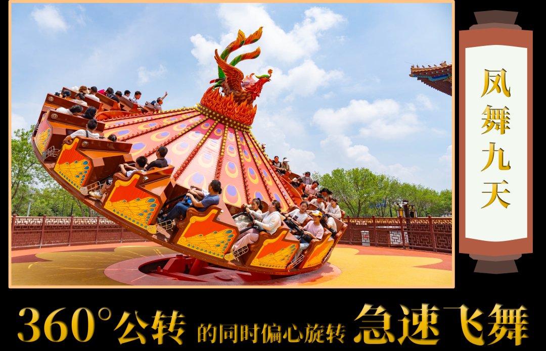 “鳳舞九天”游樂項(xiàng)目,不僅外觀精美,而且體驗(yàn)感極強(qiáng)!座艙在360°公轉(zhuǎn)的同時(shí)又有規(guī)律的偏心旋轉(zhuǎn),讓游客擁有如鳳凰飛翔般的非凡體驗(yàn)。