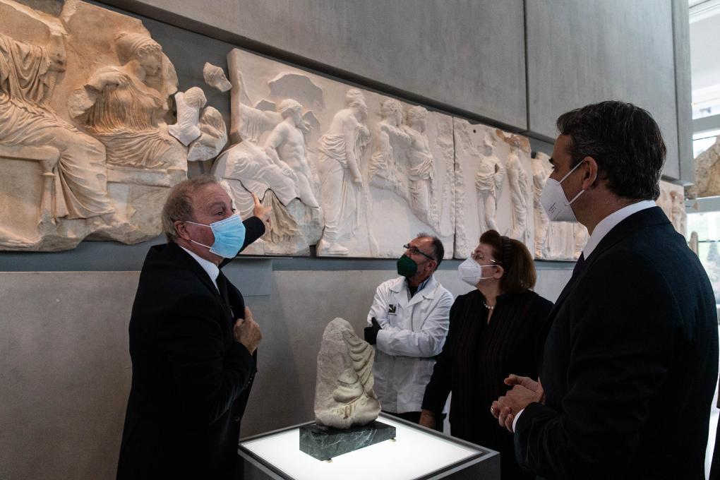 2022年1月10日,在希臘雅典衛(wèi)城博物館,希臘總理基里亞科斯·米佐塔基斯(右一)在觀看一塊原保存于意大利一家博物館的雅典衛(wèi)城帕特農(nóng)神廟石雕碎片。新華社發(fā)(馬里奧斯·羅洛斯攝)