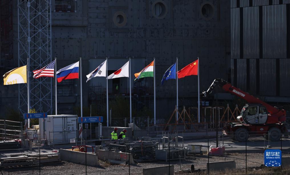 11月24日,在位于法國圣保羅-萊迪朗斯的國際熱核聚變實驗反應堆(ITER)的建造廠房外,中國、歐盟、印度、日本、韓國、俄羅斯、美國七個參與方的旗幟和ITER組織的旗幟迎風飄揚。新華社記者 高靜 攝
