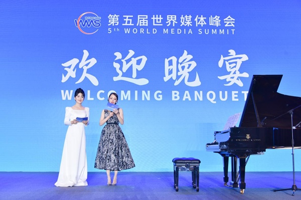 12月2日晚,青年鋼琴演奏家吉娜·愛麗絲(右一)受邀參加第五屆世界媒體峰會歡迎晚宴。(活動主辦方供圖)