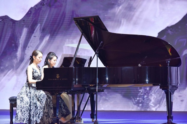 12月2日晚,青年鋼琴演奏家吉娜·愛麗絲(左一)與新華社記者許嘉桐在第五屆世界媒體峰會歡迎晚宴上同臺演奏《云宮迅音》。(活動主辦方供圖)