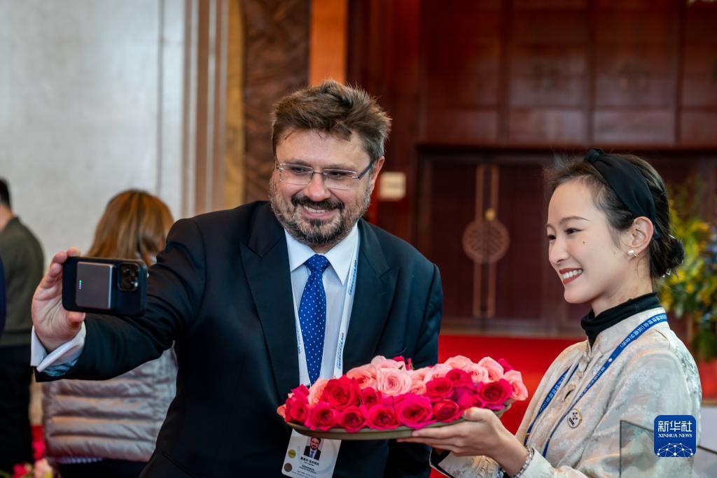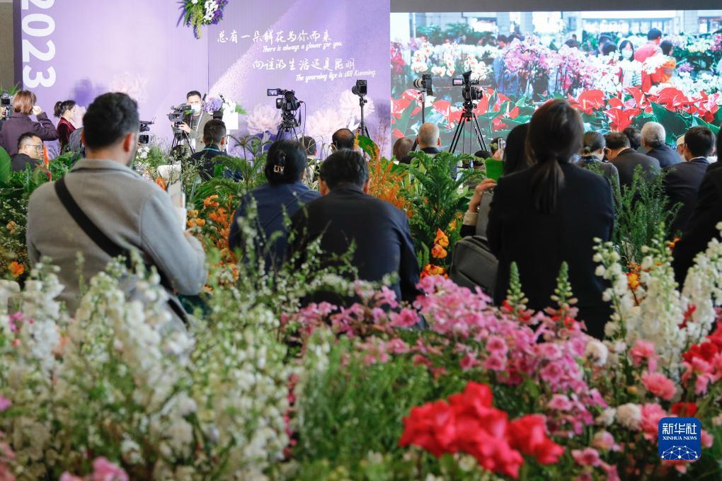 12月5日,在云南昆明參加第五屆世界媒體峰會(云南分會場)暨第二屆大象國際傳播論壇的參會代表拍攝展出的鮮花墻。