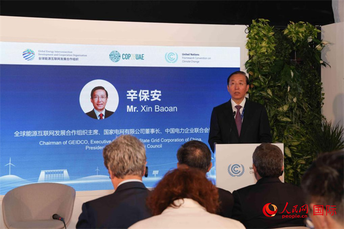 全球能源互聯網發(fā)展合作組織主席、中國國家電網有限公司董事長辛保安致辭。人民網記者 任皓宇攝