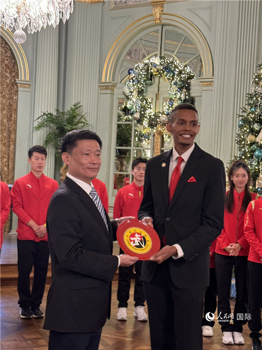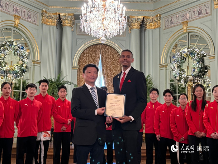 | 美國(guó)加州財(cái)政部長(zhǎng)馬世云的代表克里斯托弗·戴利(Christian Daly MPP)向中國(guó)國(guó)家武術(shù)隊(duì)團(tuán)長(zhǎng)李永強(qiáng)頒發(fā)證書(shū)。人民網(wǎng)記者 鄧圩攝 |