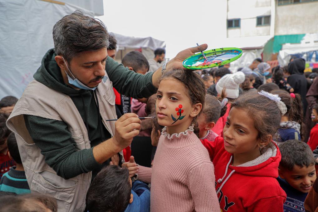 12月7日,在加沙地帶南部城市拉法的一處臨時庇護所內(nèi),志愿者和兒童進行互動。新華社發(fā)(里澤克·阿卜杜勒賈瓦德攝)