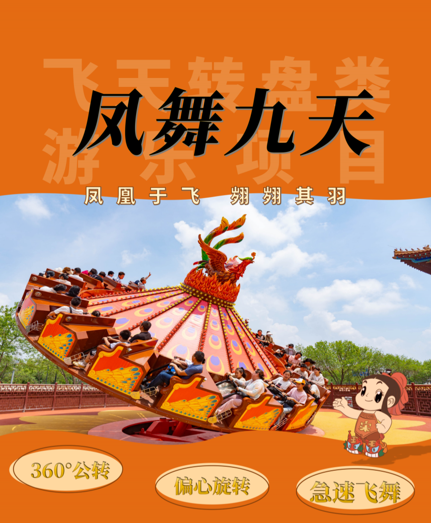 “鳳舞九天”游樂項目,不僅外觀精美,而且體驗感極強!座艙在360°公轉的同時又有規(guī)律地偏心旋轉,讓游客擁有如鳳凰飛翔般的非凡體驗。