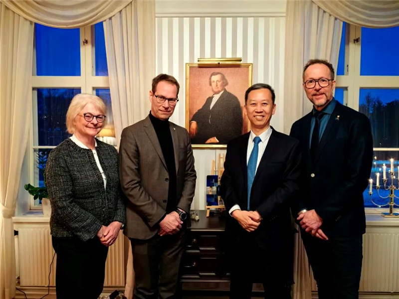 中國(guó)駐瑞典大使崔愛(ài)民(右二)會(huì)見瑞典林雪平市市長(zhǎng)桑弗里德松。中國(guó)駐瑞典大使館供圖
