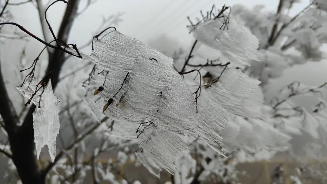 那些不透明的冰晶簇?fù)碓谝黄?,一層疊一層,一團(tuán)接著一團(tuán),被霧凇包裹的草木一枝挨著一枝,一簇連著簇,就像無(wú)數(shù)潔白的花朵開(kāi)在山間,極其壯觀。