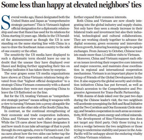 中越發(fā)展雙邊關(guān)系不針對(duì)第三方。只有那些妄圖挑撥兩國(guó)關(guān)系甚至破壞亞太和平穩(wěn)定的人,才會(huì)對(duì)中越提升關(guān)系說(shuō)三道四。