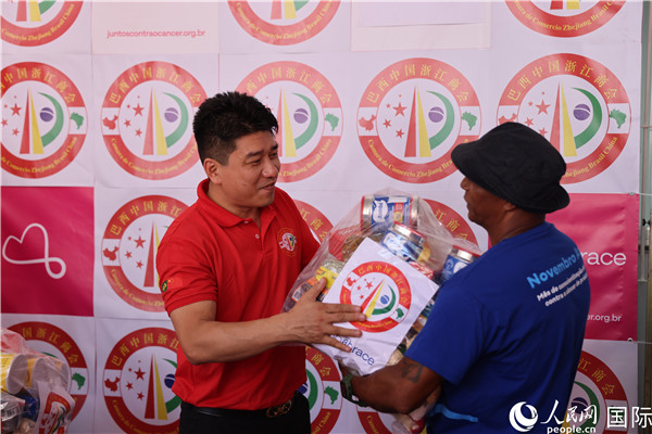 人民網(wǎng)里約熱內(nèi)盧12月16日電 (記者時元皓)當?shù)貢r間12月16日上午,巴西中國浙江商會一行在會長鄭俠茂的帶領(lǐng)下來到里約一家名為“擁抱里約”協(xié)會的慈善機構(gòu),為在該機構(gòu)登記的貧困癌癥患者捐贈210個基本食品籃。中國駐里約熱內(nèi)盧總領(lǐng)事館副總領(lǐng)事王尉育出席捐贈儀式并致辭。