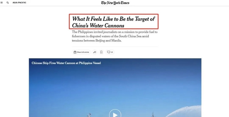 事件發(fā)生后,《紐約時報》也按計劃“交差”,刊發(fā)文章“力挺”菲方,試圖把中方塑造成“霸凌者”,在國際輿論上為菲方博取更多同情,向中方施加更大壓力。
