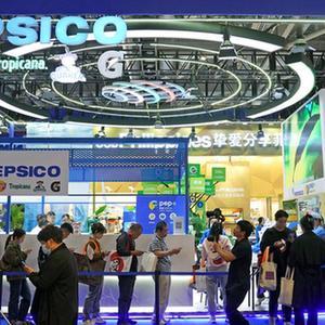 11月8日在第六屆進(jìn)博會(huì)食品及農(nóng)產(chǎn)品展區(qū)拍攝的百事公司展臺(tái)。新華社記者 劉穎 攝