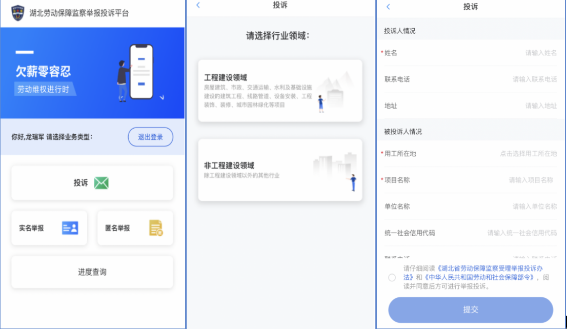 (一)舉報(bào)投訴登記。勞動(dòng)者可以點(diǎn)擊“投訴”“ 實(shí)名舉報(bào)”或“匿名舉報(bào)”,再按照行業(yè)領(lǐng)域選擇“工程建設(shè)領(lǐng)域”或“非工程建設(shè)領(lǐng)域”進(jìn)入業(yè)務(wù)辦理界面,填寫投訴或舉報(bào)事由、訴求等相關(guān)信息,并上傳證據(jù)資料。