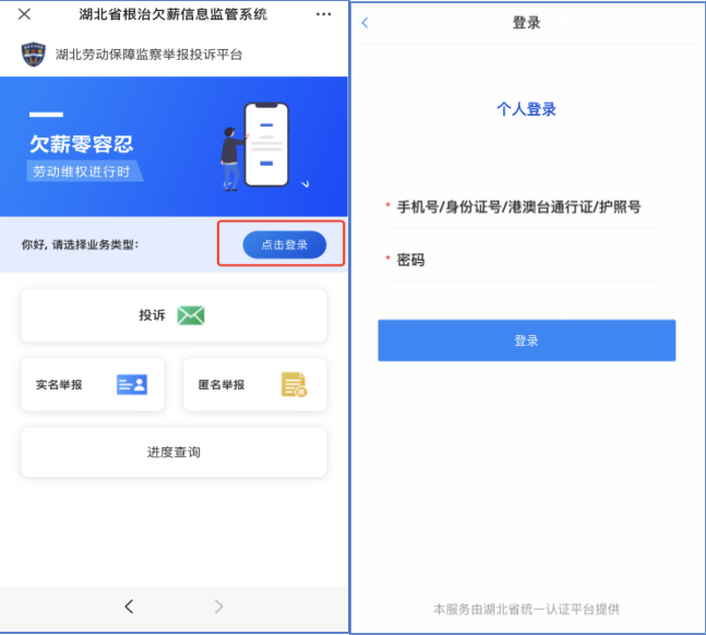 劃重點(diǎn):勞動(dòng)者舉報(bào)投訴必須使用湖北省政務(wù)服務(wù)網(wǎng)注冊(cè)的“個(gè)人統(tǒng)一身份認(rèn)證賬號(hào)”進(jìn)行實(shí)名登錄喔!