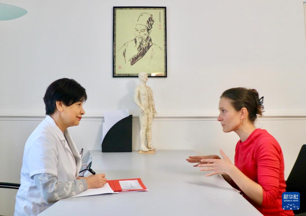 12月11日,在瑞士邊境城市沙夫豪森的一家中醫(yī)診所,中醫(yī)師賈克杰(左)與患者米羅斯拉娃交流。
