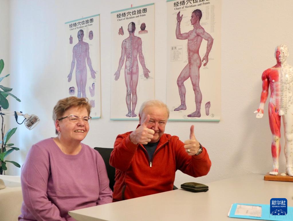 12月11日,在瑞士邊境城市沙夫豪森的一家中醫(yī)診所,患者莫吉爾(右)稱贊中醫(yī)療效顯著。