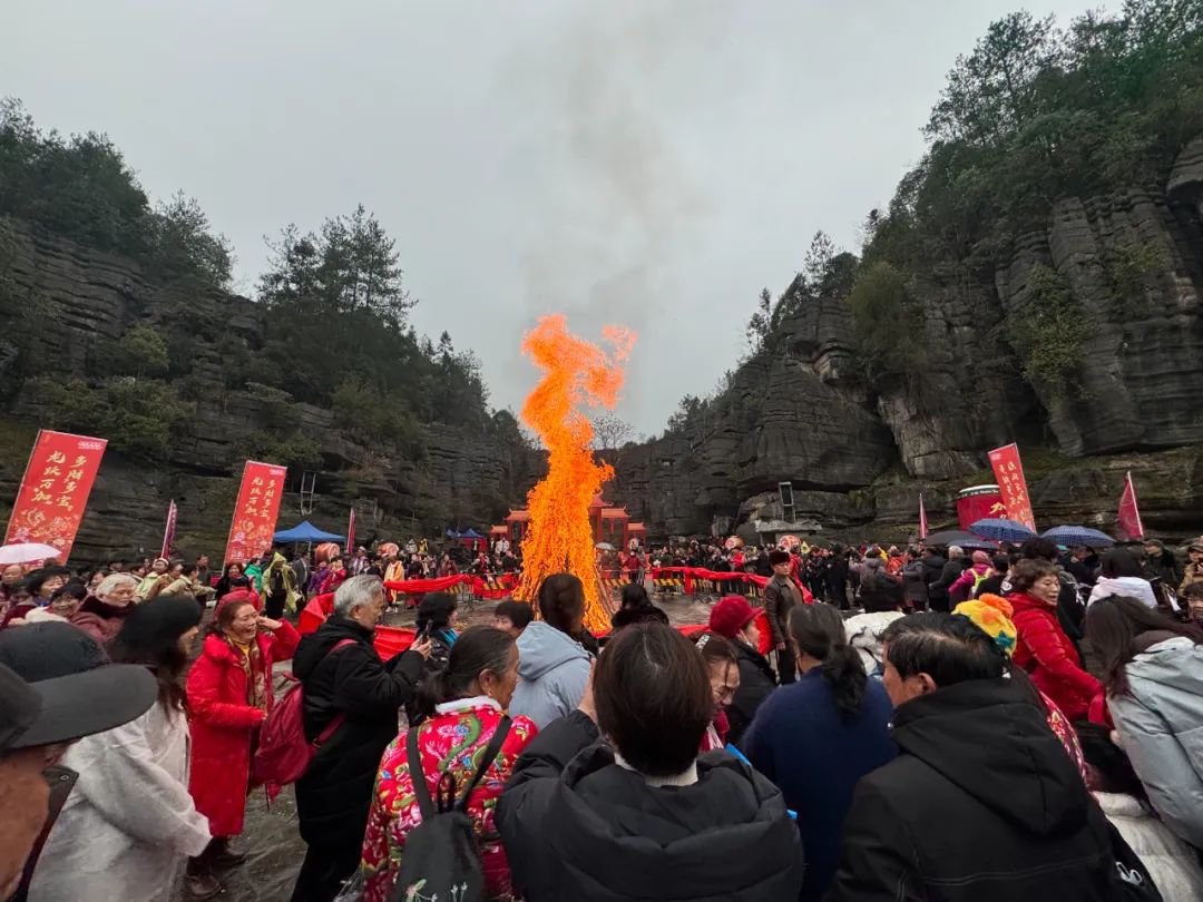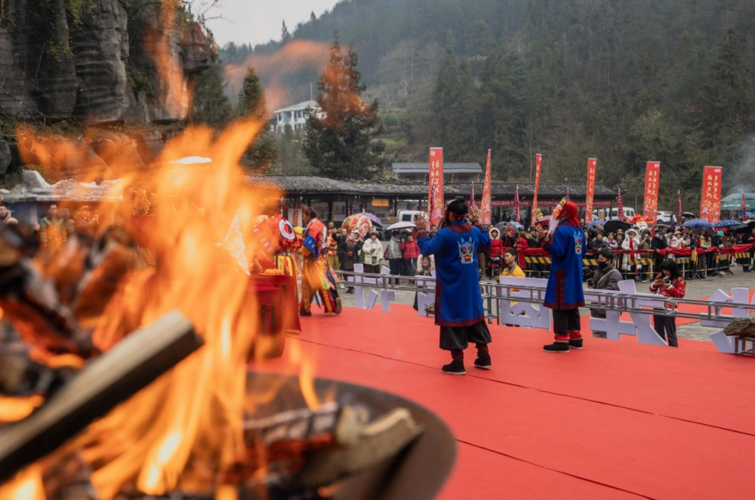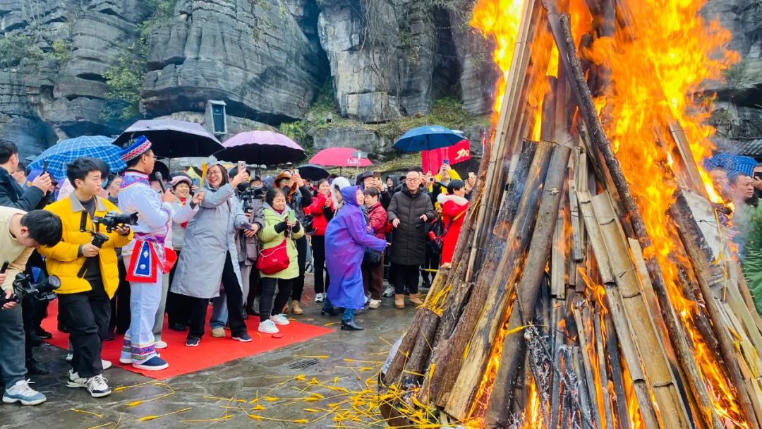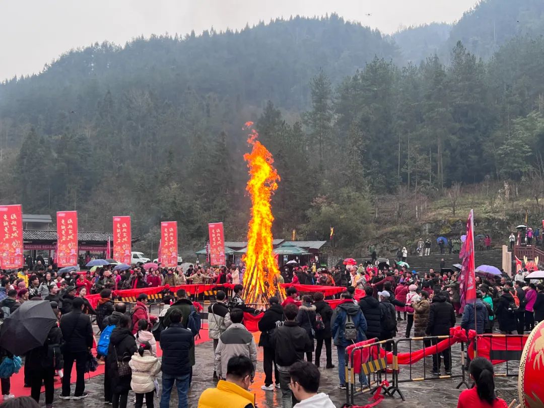 土家梯瑪(祭司)點燃了篝火,發(fā)放金穗,祈愿來年風(fēng)調(diào)雨順、年年有余。這熊熊篝火象征著新年的希望,現(xiàn)場的游客和村寨民眾一起感受著神秘的土家文化和年俗,共同祈福,共享民族大融合。