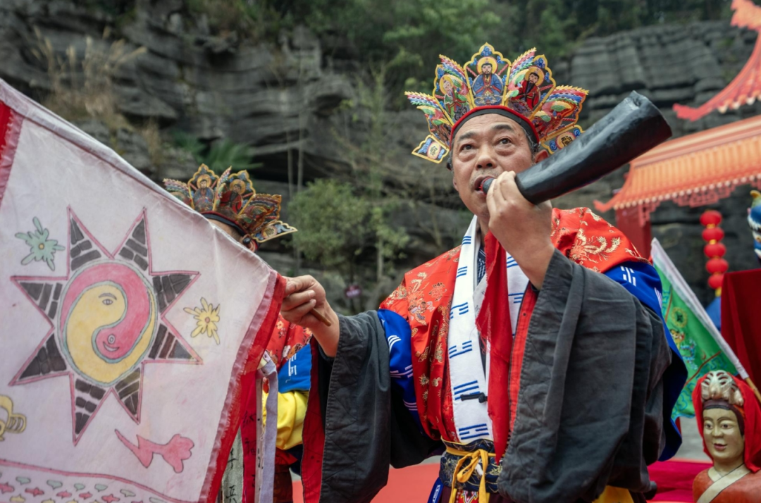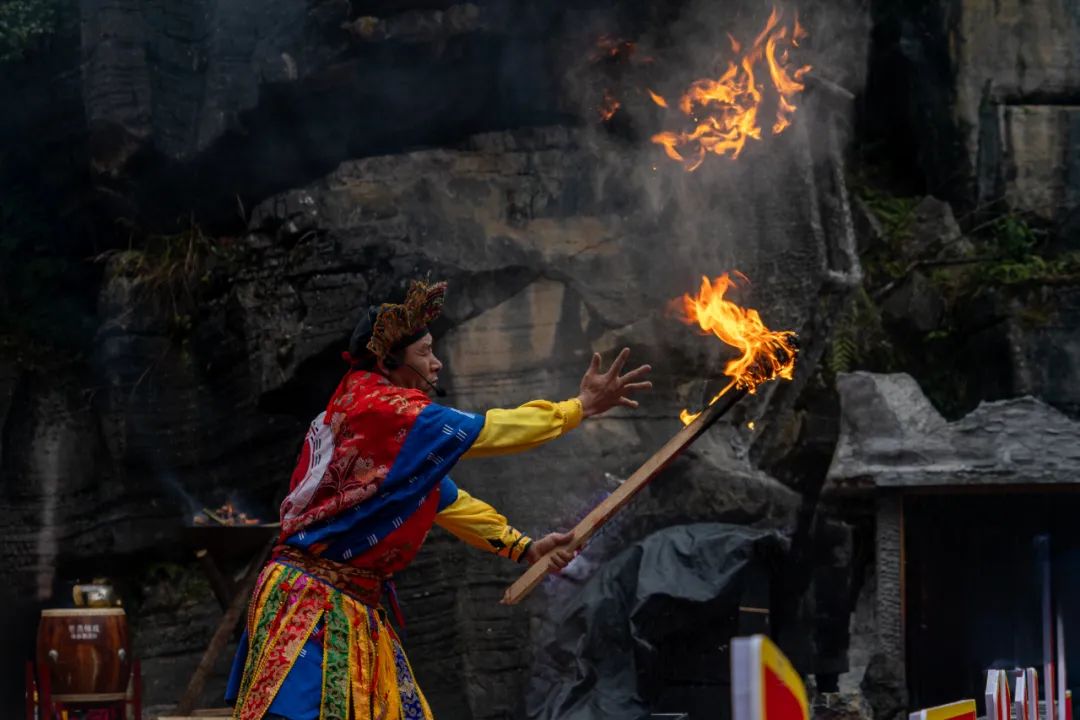 廟會的開寨祈福儀式是開幕式的焦點,分為土鼓苗歌迎賓、土家非遺儺戲和茅古斯祈福等環(huán)節(jié),展現(xiàn)了豐富的民俗表演?,F(xiàn)場游客應(yīng)接不暇,陶醉在劇情沉浸式的演出中。