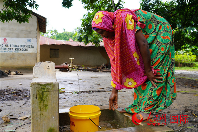 | 一名村民從中國專家組捐建的供水設施中取水。人民網(wǎng)記者 黃煒鑫攝 |