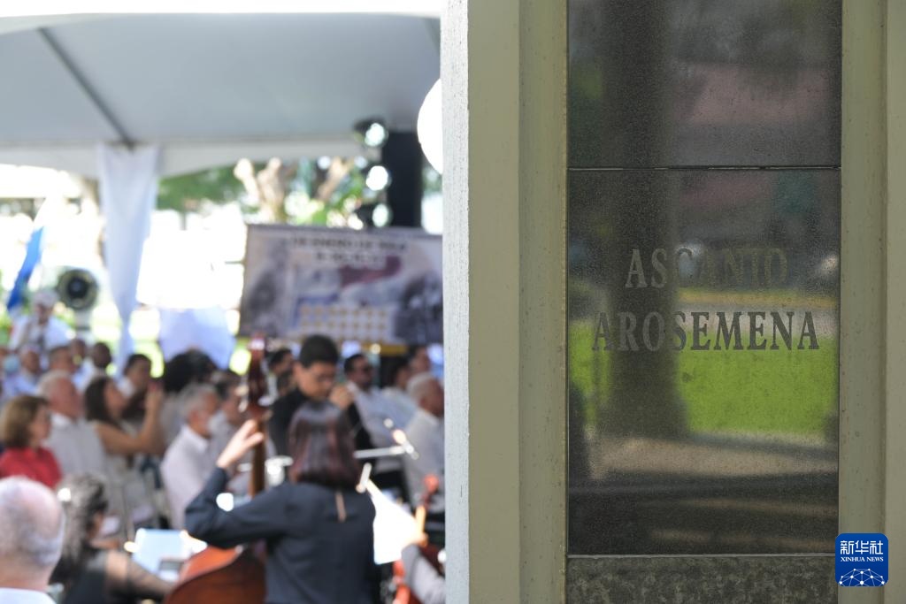 1月9日,在巴拿馬首都巴拿馬城,巴拿馬政府在“永恒之火”紀(jì)念碑旁舉辦“護(hù)旗運(yùn)動(dòng)”60周年紀(jì)念儀式,照片中的石柱紀(jì)念的是在美國軍警鎮(zhèn)壓中死亡的第一位學(xué)生阿羅塞梅納。新華社記者 陳昊佺 攝