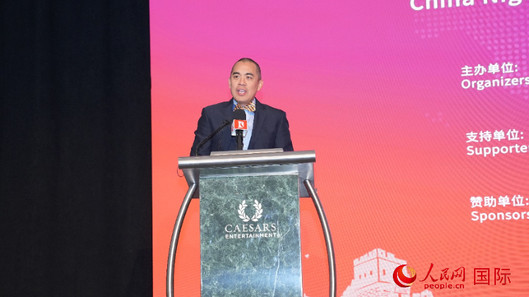 內(nèi)華達(dá)州副州長(zhǎng)辦公室幕僚長(zhǎng)魯?shù)稀づ撩鲌D安在論壇致辭。人民網(wǎng)記者 鄧圩攝