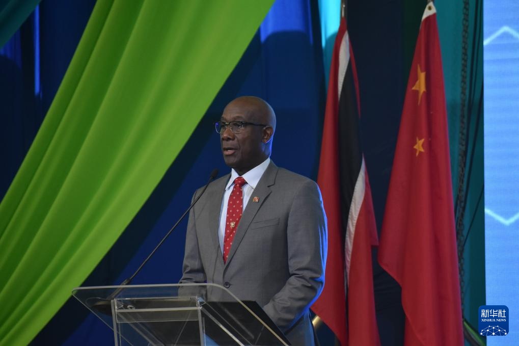 1月10日,特立尼達和多巴哥總理羅利在位于利薩斯角港的鳳凰工業(yè)園開園儀式上致辭。新華社記者 朱婉君 攝