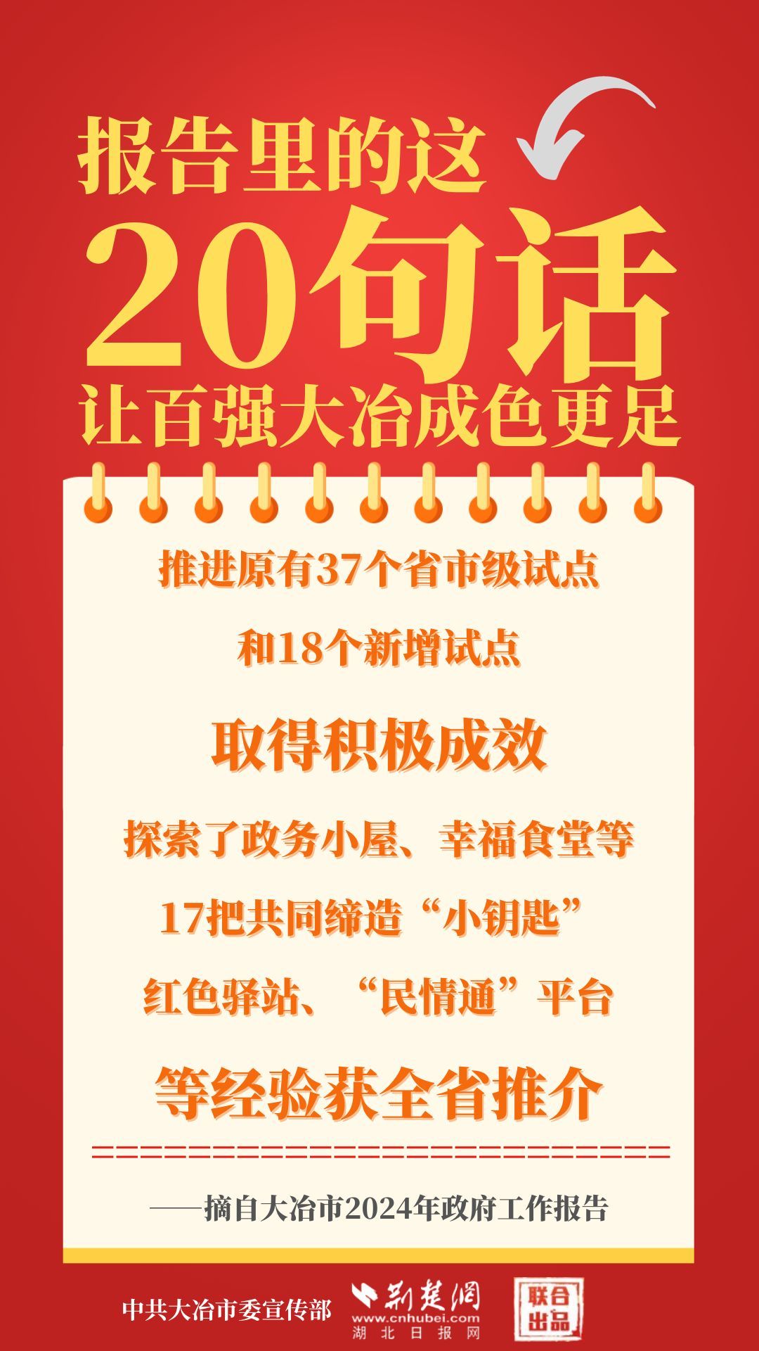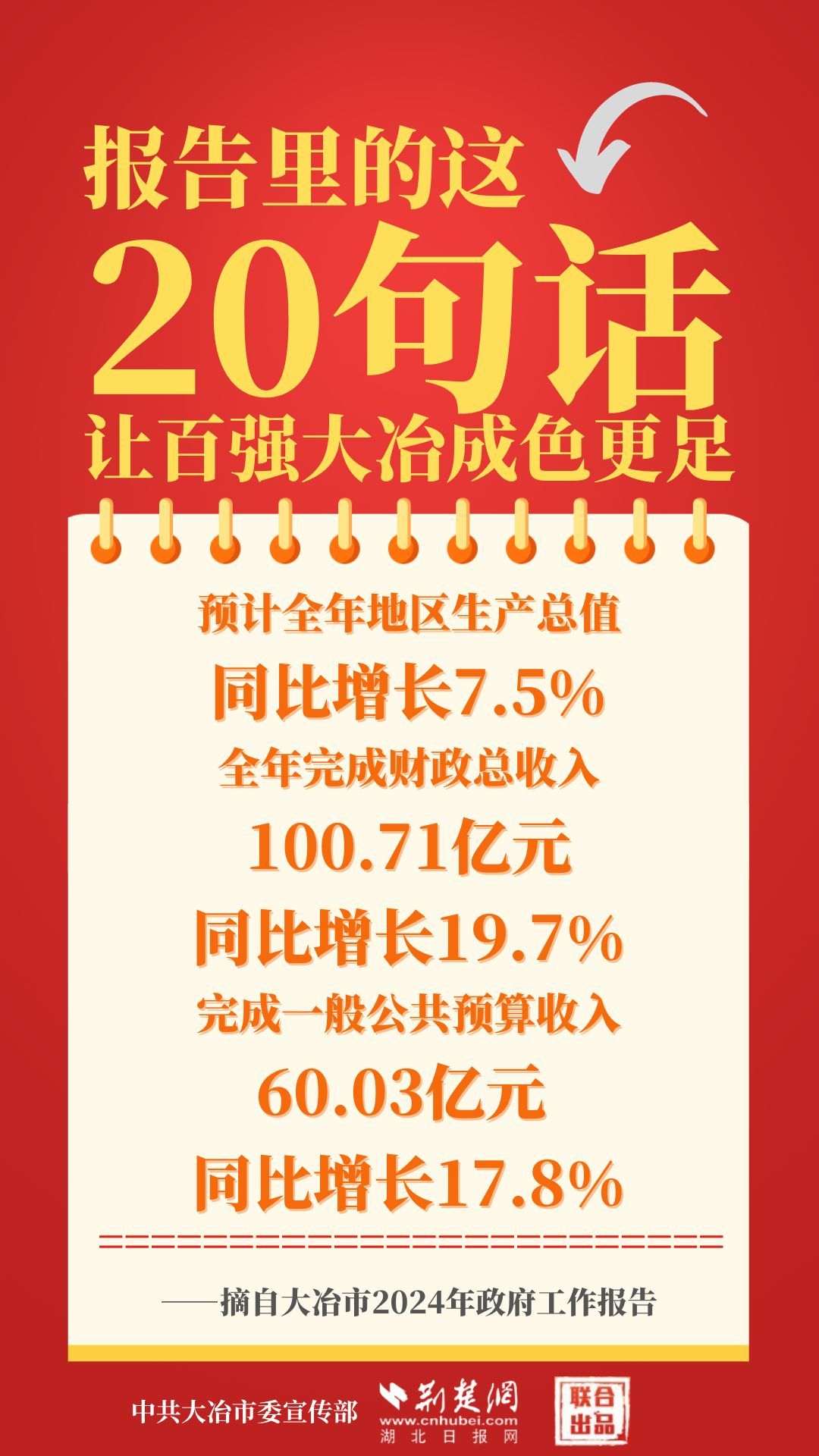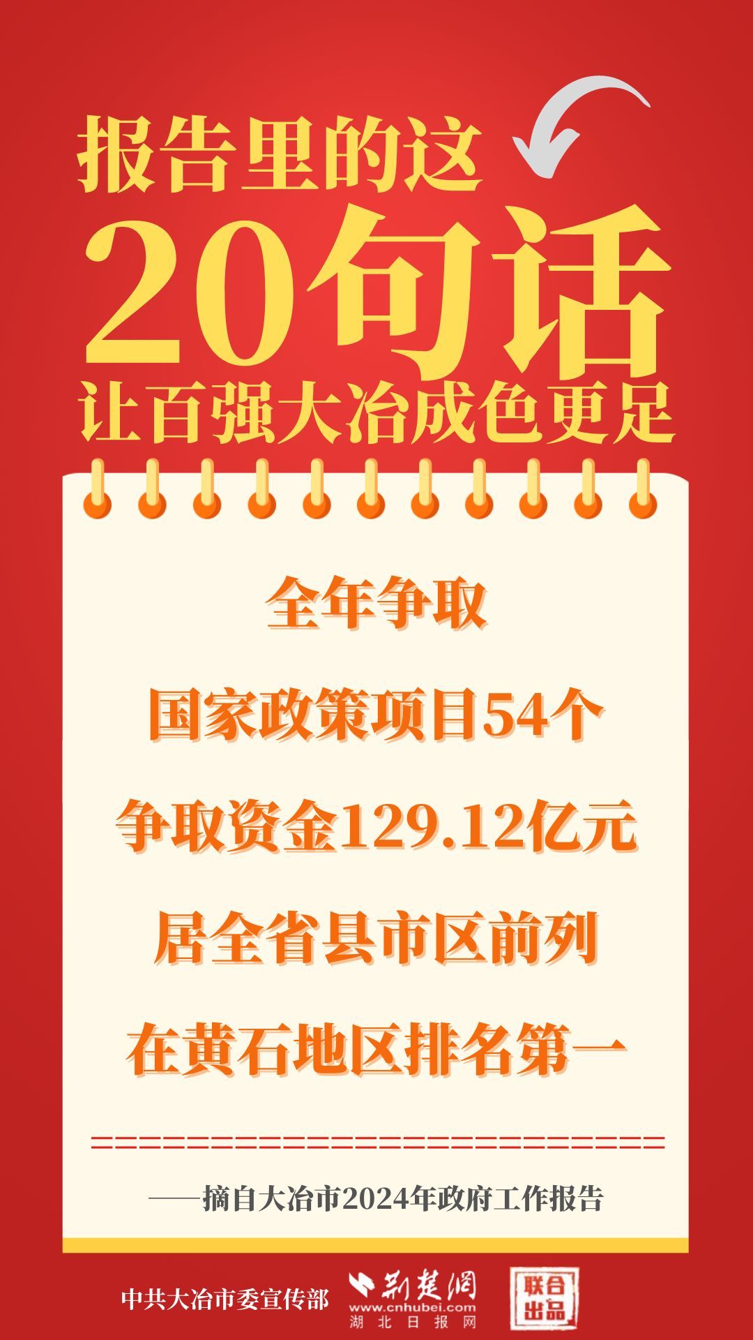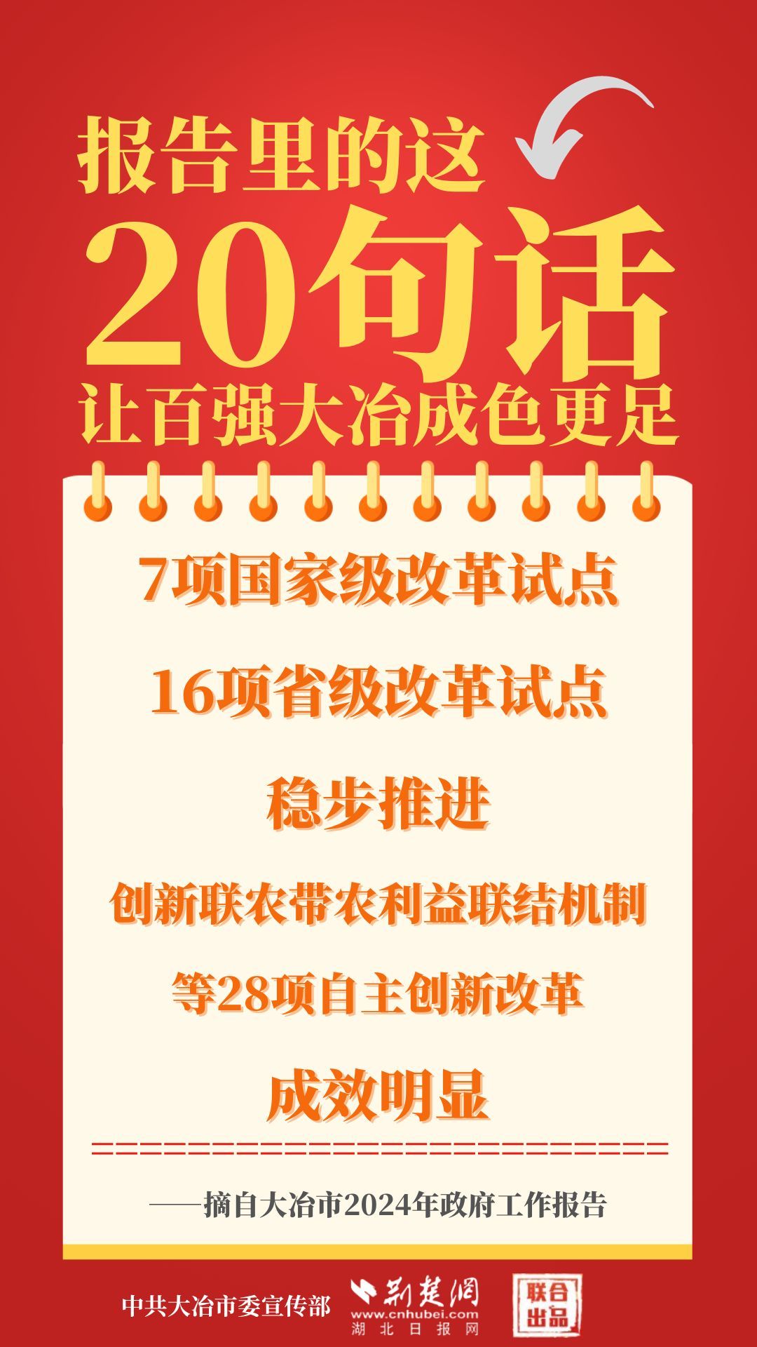 1月12日,大冶市第七屆人民代表大會(huì)第四次會(huì)議開(kāi)幕,大冶市委副書記、市長(zhǎng)孫輒作政府工作報(bào)告。報(bào)告里的這20句話,讓百?gòu)?qiáng)大冶成色更足。